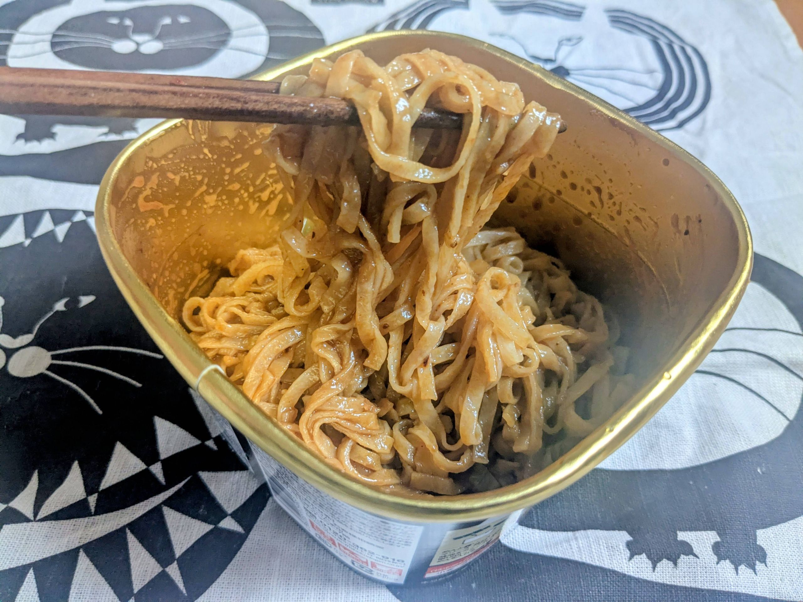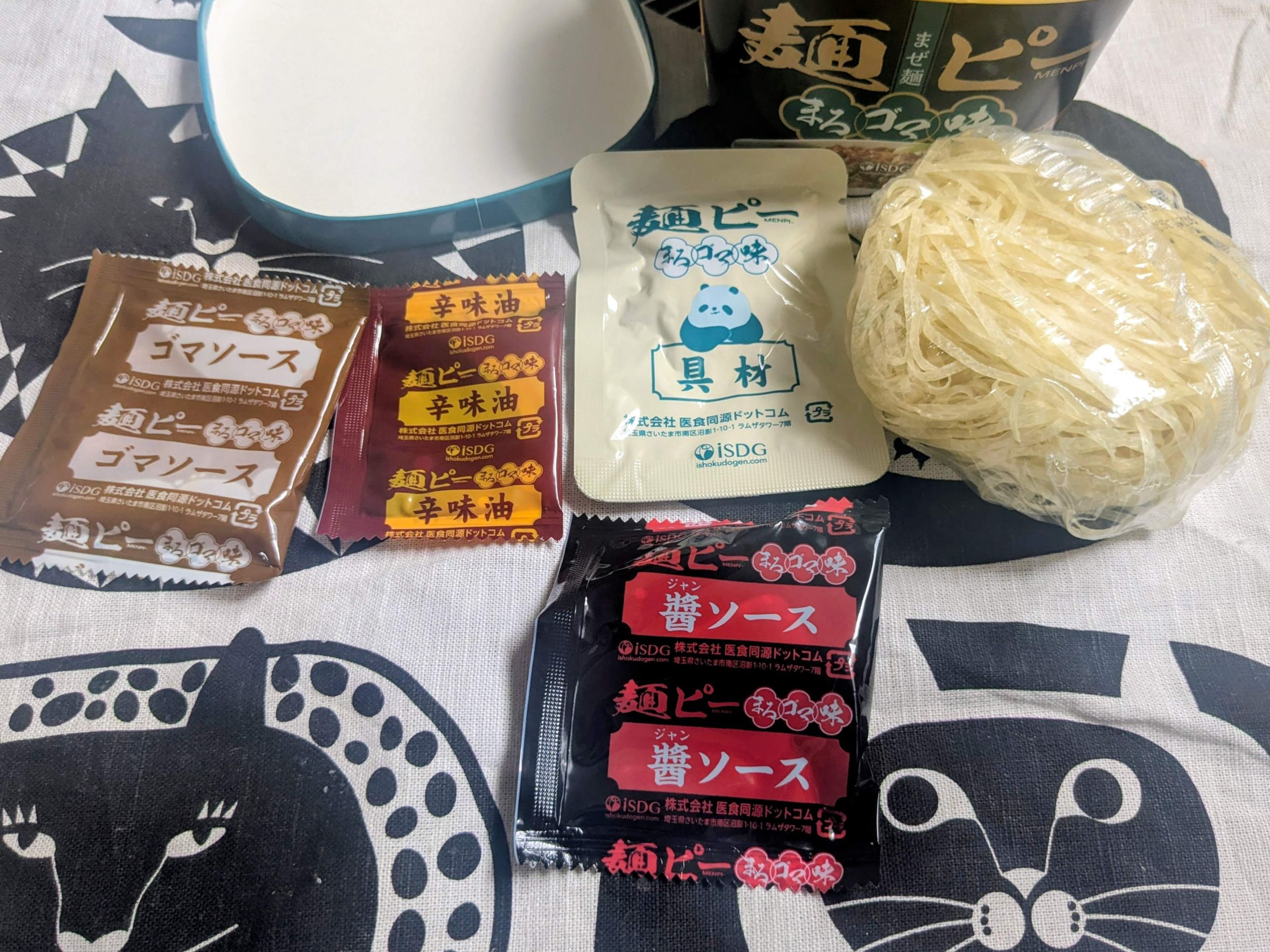 中身はめん、醤ソース、ゴマソース、辛味油、具材。